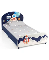 Kids Upholstered Platform Bed Children Twin Size Wooden Bed Astronaut Pattern