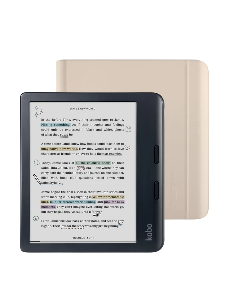 Introducing our most inspiring eReader yet: the new Kobo Libra Colour. Bring magic to your margins by annotating your pages, organizing your thoughts, and highlighting inspiring lines, all in color. With Kobo Stylus 2 compatibility, you can dive deeper into your favorite stories by marking up meaningful moments and highlighting powerful passages in the eBooks you love. (Stylus 2, Ac adapter, and SleepCovers are optional accessories, sold separately.) Includes Usb-c sync/charge cable.
