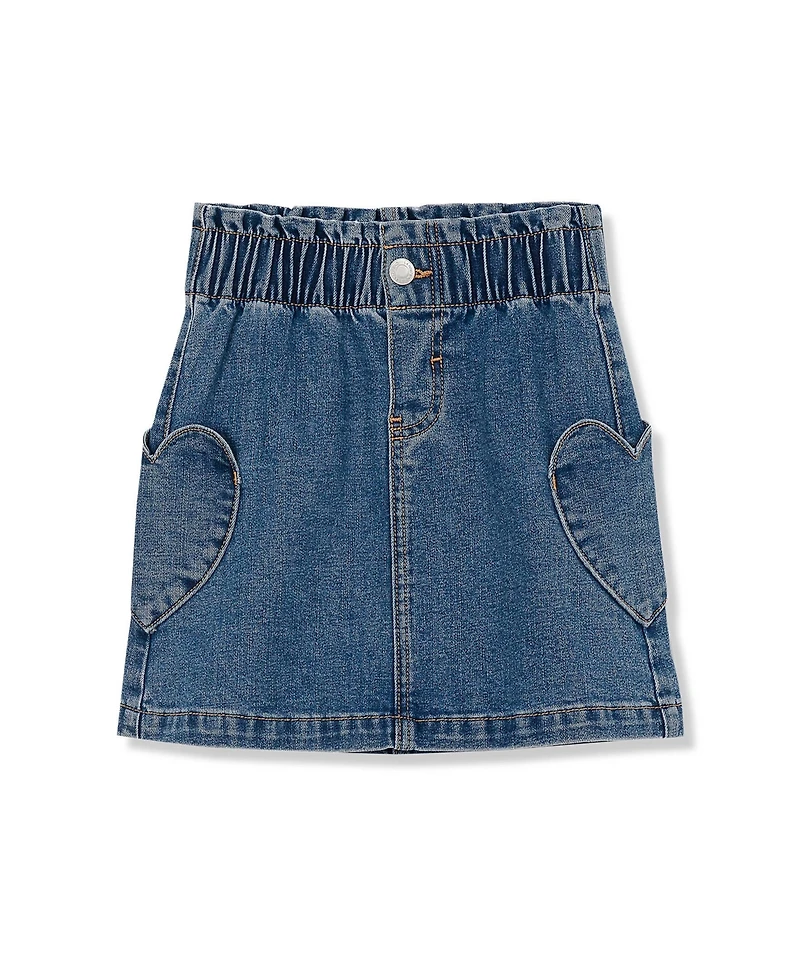Crafted with a comfy elastic waist and adorable heart-shaped pockets, this denim skirt will coordinate with your little girl's entire spring wardrobe. She'll love its comfort, versatility and unique details..