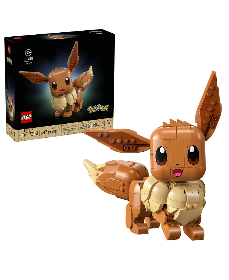 Create a brick-built version of a beloved character with the Lego Pokemon Eevee 72151 building set for adults ages 18 and up. This detailed Normal-type Pokemon figure captures everything that makes Eevee iconic, including its wide, expressive eyes, full bushy tail and perky ears, all faithfully recreated with Lego bricks. This Eevee figure is packed with personality. Builders can pose their completed Eevee model in authentic positions.