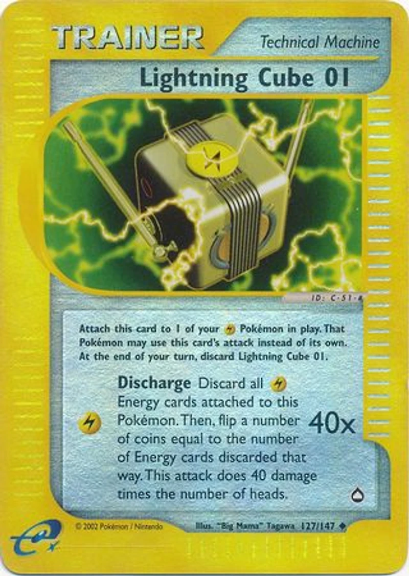 Set: Aquapolis Card Number: 127/147 Rarity: Uncommon Illustrator: 'Big Mama' Tagawa Card Type: Trainer - Technical Machine Name: Lightning Cube 01 Finish: Reverse Holo Attack #1: L Discharge (40x) Discard all Lightning Energy cards attached to this Pokmon. Then , flip a number of coins equal to the number of Energy cards discarded that way. This attack does 40 damage times the number of heads. Card Text: Attach this card to 1 of your Lightning Pokmon in play. That Pokmon may use this card's attack instead of its own. At the end of your turn discard Lightning Cube 01. Edition: 1st Manufacturer: Wizards of the Coast
