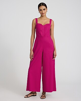 Linen-Blend Sweetheart Button Front Wide Leg Jumpsuit