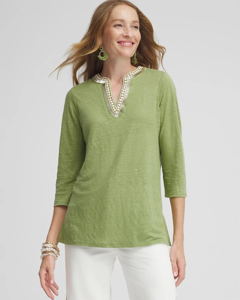 The Linen Embellished Tunic makes your favorite fabric even more effortless. This all-linen design features the ease of a linen body, plus face-flattering bead details on the split neck. Wear it with crops or pants for a simple and stylish way to dress for the day.