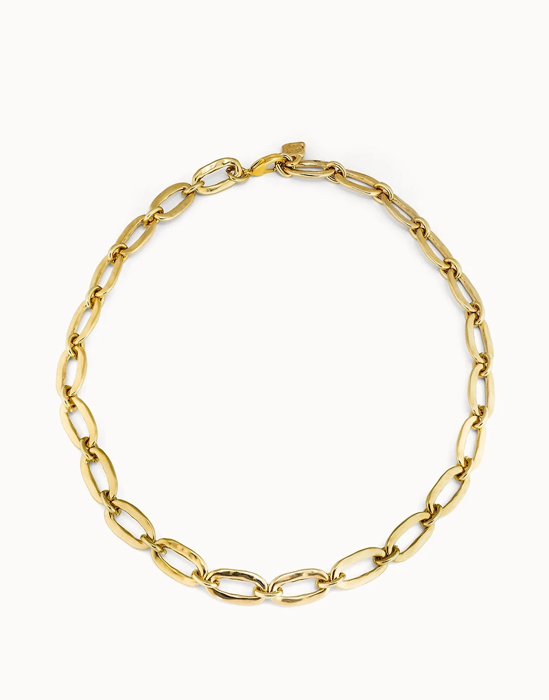 18K gold-plated necklace with an original link shape. Design elaborated with a long chain and a classic carabiner clasp. Made in Spain under a 100% handmade process.