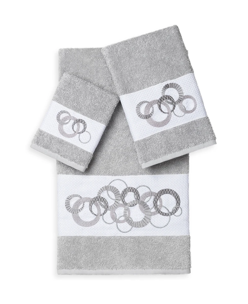 The Annabelle Embellished Towel Collection features a whimsical circle motif with metallic accents on a textured woven border. These soft and luxurious towels offer lasting absorbency and superior durability. 3PC Embellished Set includes 1 Bath Towel,1 Hand Towel, 1 Washcloth.