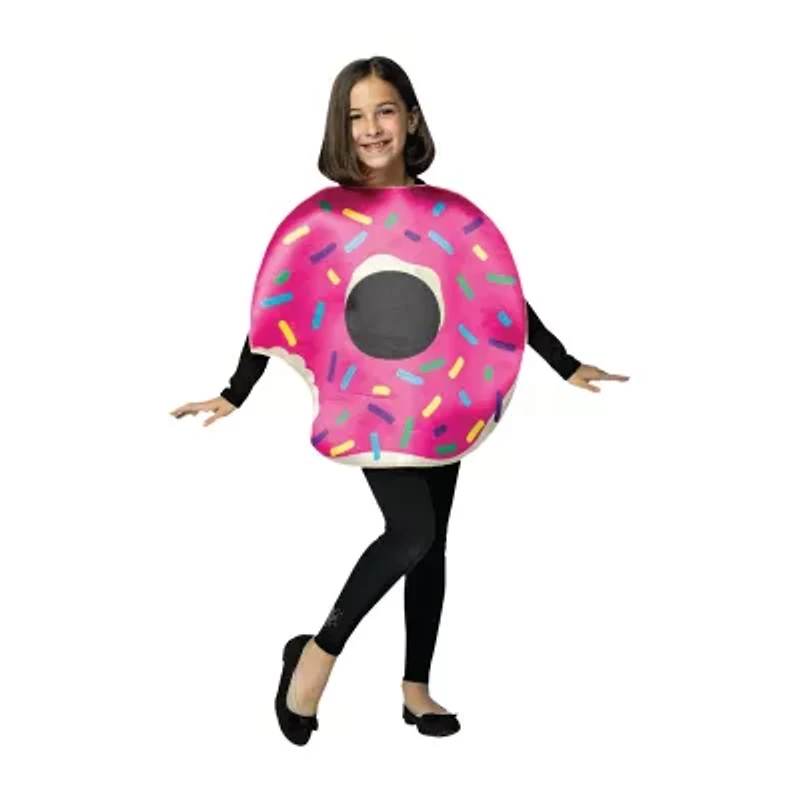 Strawberry donut with bite child costume. The sweetest thing around! Includes: tunic with screen print depicting pink frosted donut covered with multi-colored sprinkles and bite taken out of the side. Head, arms, and legs are visible. Costume covers roughly from neck to waist. 100% Polyester. Available sizes: M/L - 7-10. Black shirt, pants and shoes are not included.