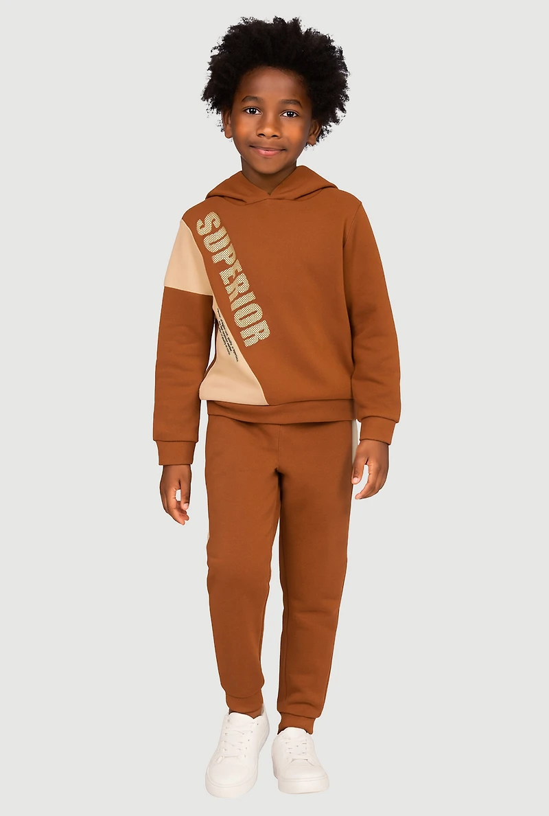 Upgrade your little guy's casual wardrobe with the Little Boys Superior Pullover Hoodie and Joggers Set. Designed for comfort and style, this athleisure duo combines cozy fleece fabric with a trendy color-blocked graphic print that screams cool. Perfect for playdates, chill days, or weekend adventures, the mid-rise joggers taper at the ankle for a sleek fit while the hooded pullover keeps things effortlessly laid-back. Easy to mix and match, this set is a no-brainer for parents who want their kids looking sharp without sacrificing comfort.