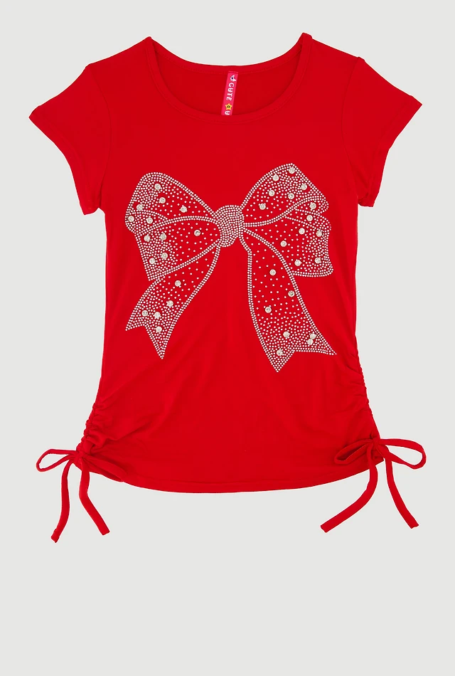 Little Girls Bow Rhinestone Studded Ruched T-Shirt, Red, Size 4