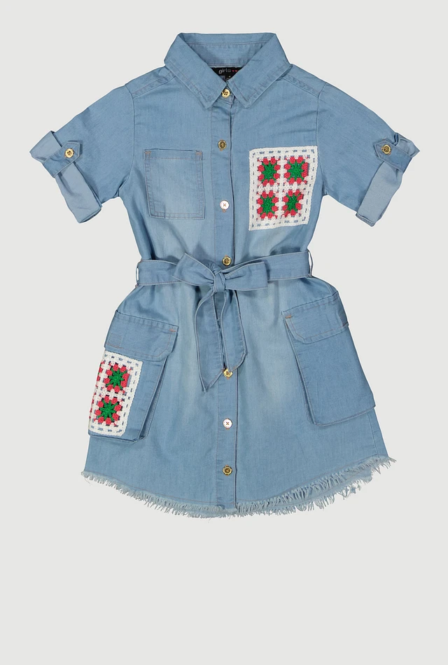 Little Girls Crochet Patch Chambray Shirt Dress, Blue, Size 6X