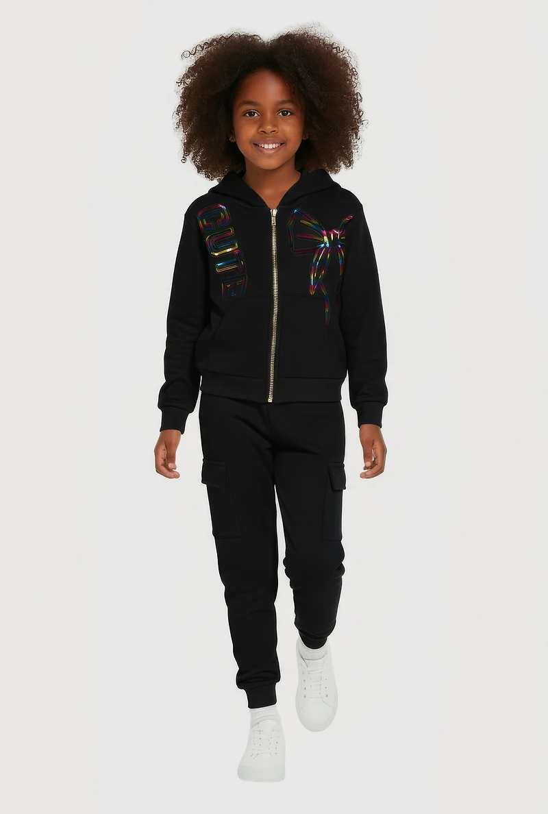 Upgrade her casual wardrobe with this adorable Little Girls Cute Foil Screen Patch Graphic Sweatshirt and Cargo Joggers. Designed for comfort and style, the fleece fabric keeps her cozy while the zip front and hooded neckline add a trendy touch. Perfect for playdates or chill days, this mid-rise, tapered jogger set blends fun graphics with practical cargo pockets for all her essentials. Soft fleece material for all-day comfort Stylish foil screen graphic with embossed details Zip front sweatshirt with hood for easy layering Mid-rise tapered joggers with cargo pockets Classic fit designed for casual everyday wear Ankle-length pants perfect for active kids Content and Care Material: 100% Polyester Care Instructions: Machine Wash, Tumble Dry Country Of Origin: China Rainbow Item Number 3622038340136 BLACK - 3622038340136001