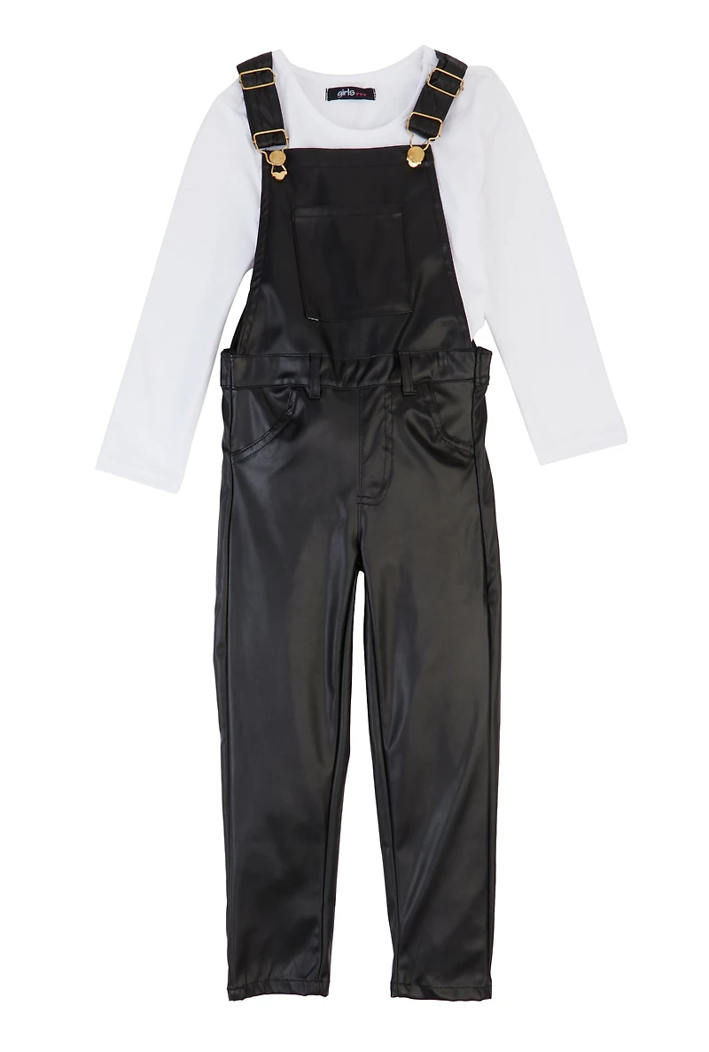 Little Girls Faux Leather Overalls with Long Sleeve Top