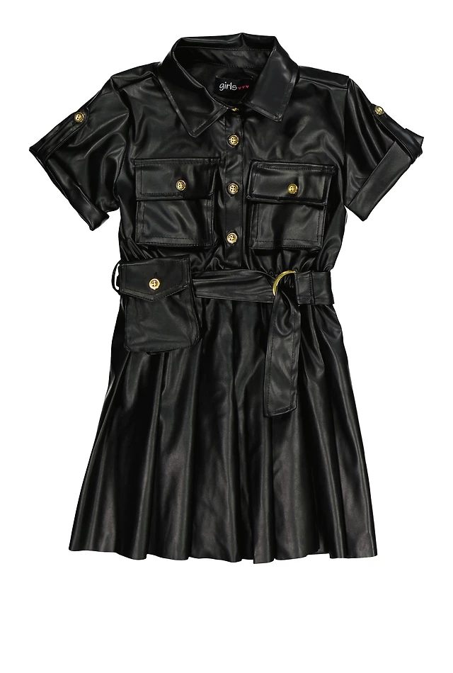 Little Girls Faux Leather Pleated Button Front Shirt Dress