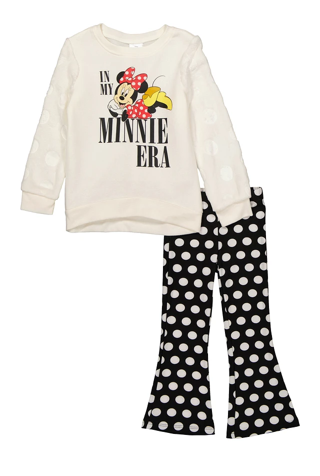 Little Girls Minnie Mouse Plush Sleeve Sweatshirt and Flare Pants, White, Size 5