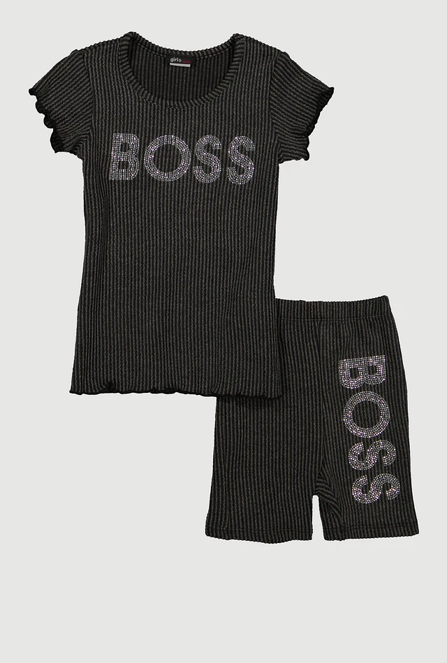 Little Girls Rhinestone Boss Graphic Tee and Biker Shorts, Grey, Size 6X