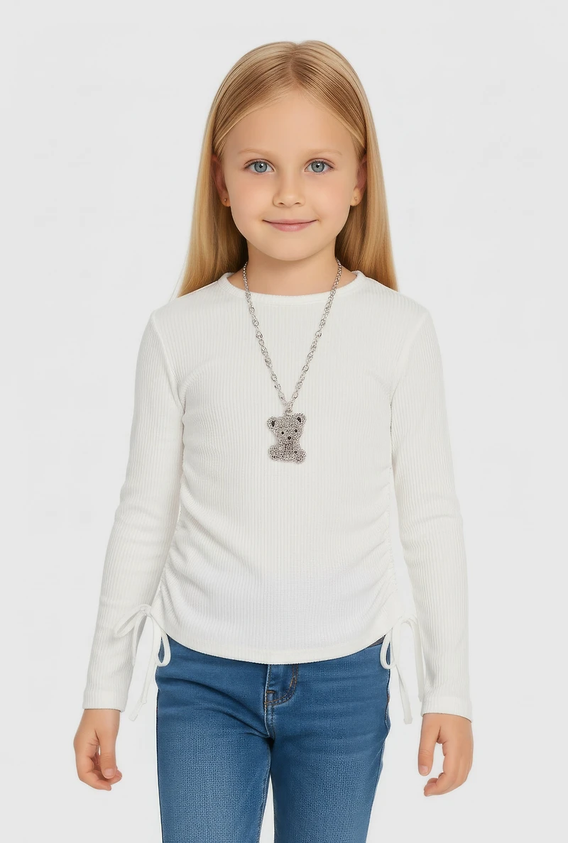 Make everyday playtime extra cute with this Little Girls Ribbed Knit Long Sleeve Tee featuring a charming removable bear necklace. Crafted from soft ribbed knit fabric, this tee offers cozy comfort and a flattering ruched detail that adds a stylish twist to a classic crew neck design. Perfect for casual days or layering up, it’s a must-have that brings a touch of fun and sparkle to any little girl’s wardrobe.