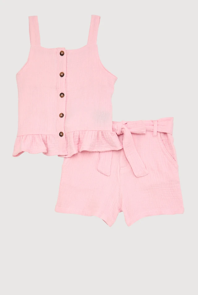 Little Girls Sleeveless Button Front Ruffle Hem Top and Shorts, Pink, Size 5-6