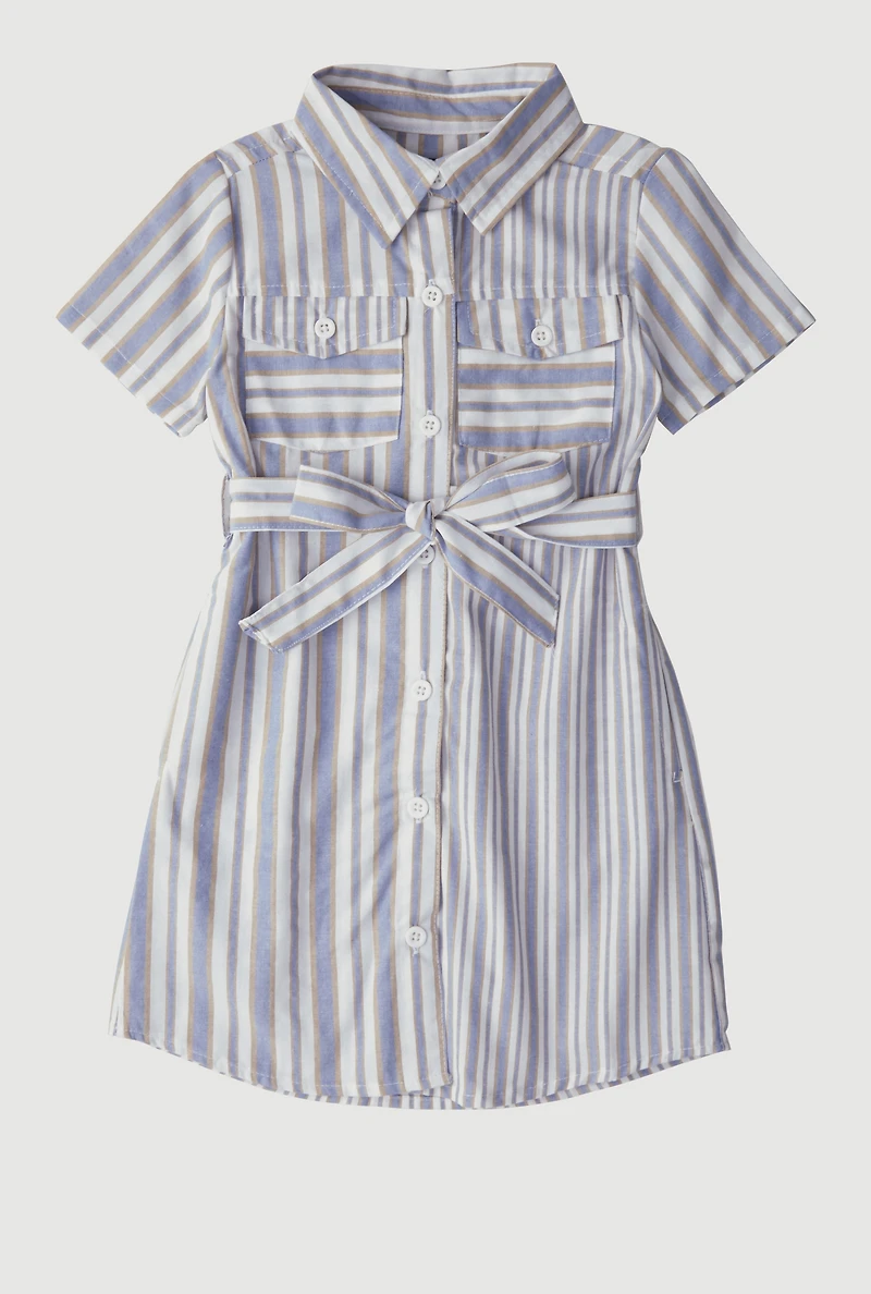 Little Girls Striped Tie Waist Belted Shirt Dress