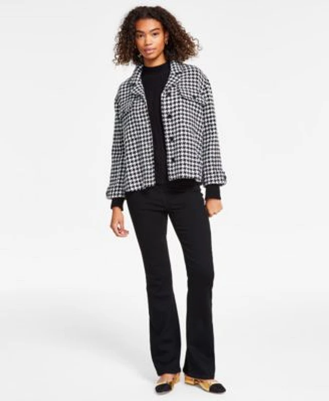 Liverpool Los Angeles Womens Long Sleeve Boxy Shacket Long Sleeve Mock Neck Cable Sweater High Rise Bootcut Jeans