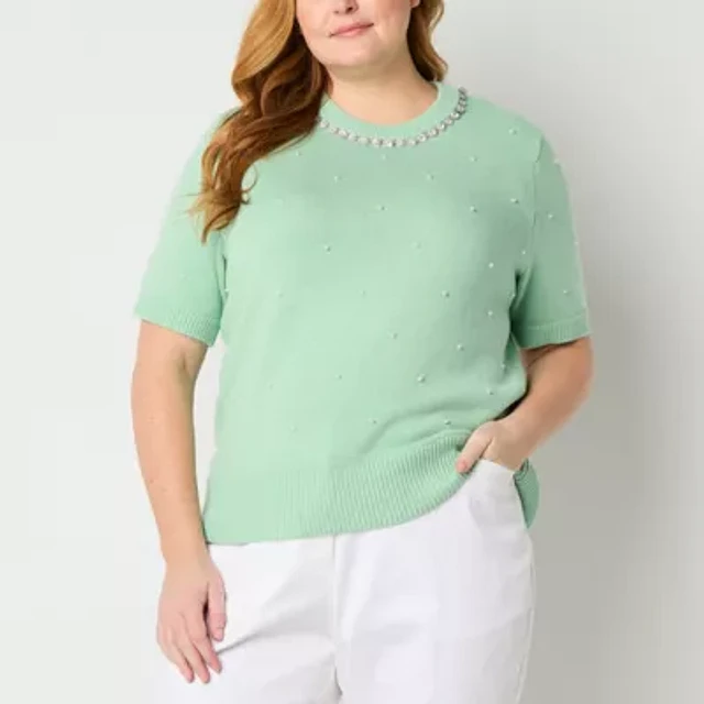 Liz Claiborne Plus Womens Crew Neck Embellished Short Sleeve Pullover Sweater