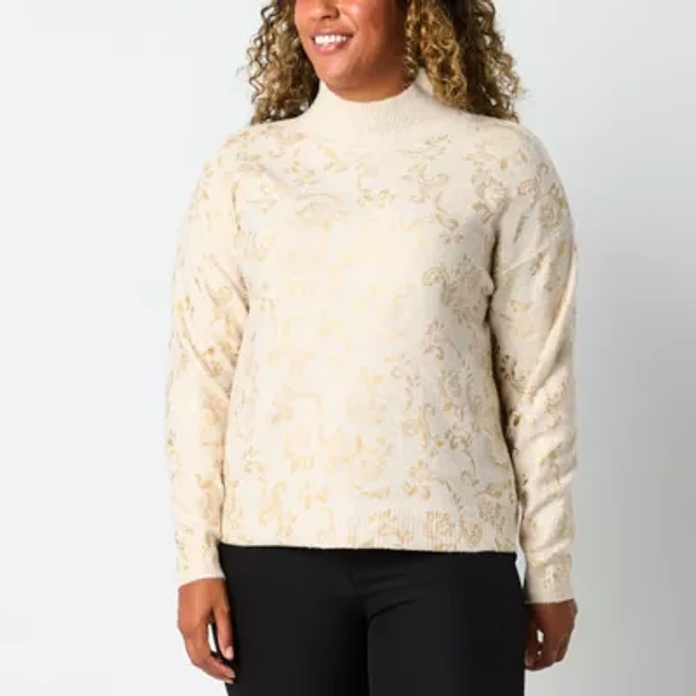 Liz Claiborne Plus Womens Mock Neck Long Sleeve Scroll Pullover Sweater