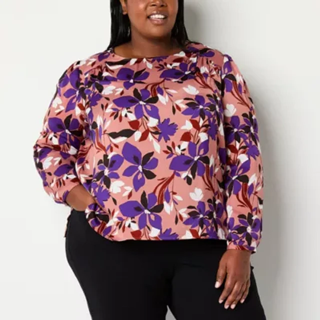 Liz Claiborne Plus Womens Round Neck Long Sleeve Satin Blouse