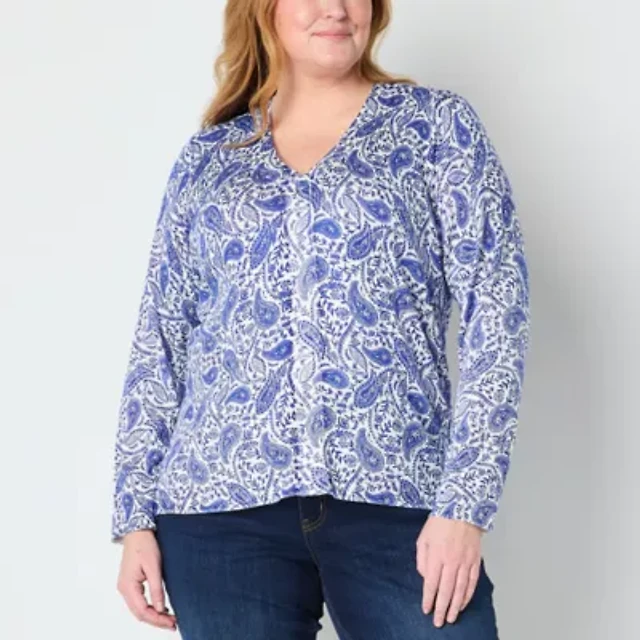 Liz Claiborne Plus Womens V Neck Long Sleeve Paisley Pullover Sweater