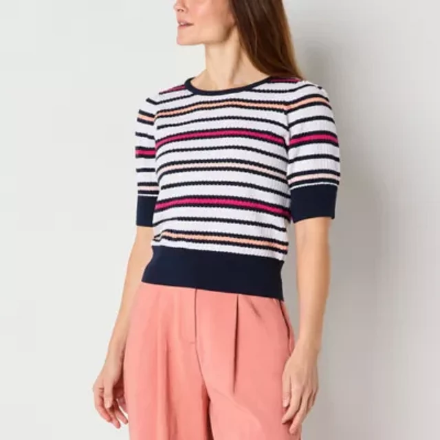 Liz Claiborne Womens Crew Neck Elbow Sleeve Striped Pullover Sweater