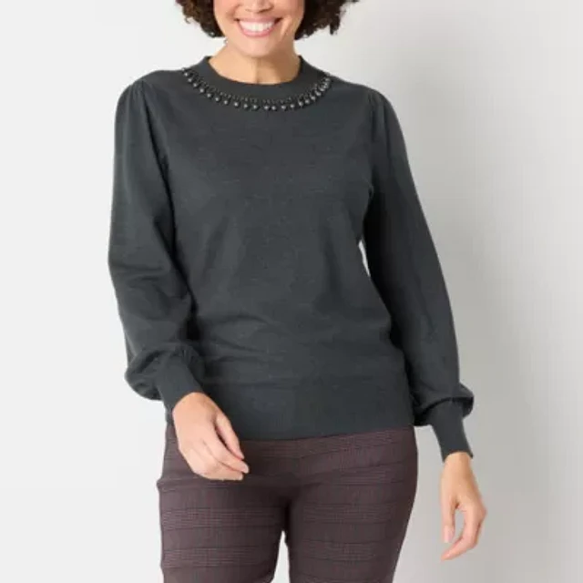 Liz Claiborne Womens Crew Neck Embellished Long Sleeve Pullover Sweater
