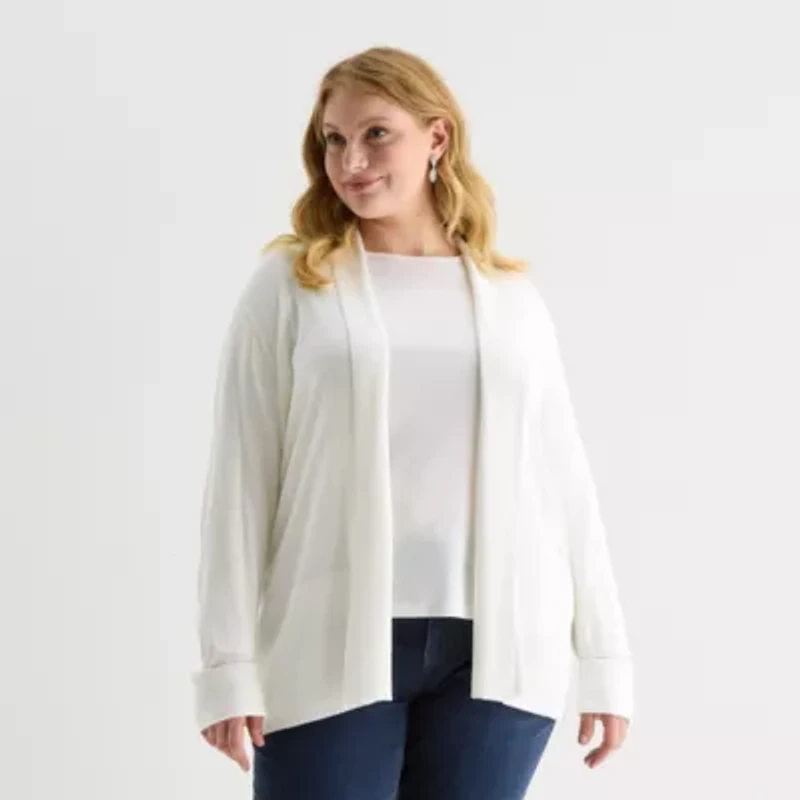 This Liz Claiborne women�s plus layered sweater is made from soft knit fabric, delivering style and comfort. The open-front design with long fitted sleeves makes it ideal for work, outings or transitional dressing.