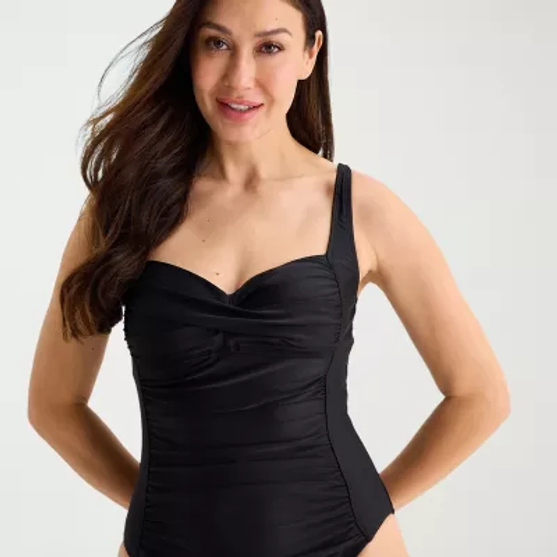 You'll be vacation-ready wearing this classic women's Liz Claiborne one-piece swimsuit. Made from a smooth stretch fabric, this lined swimsuit has a twisted sweetheart neckline, ruched detail to flatter your silhouette and minimize your waist, and adjustable shoulder straps.