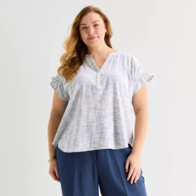 Liz Claiborne Womens Plus Split Crew Neck Short Sleeve Blouse