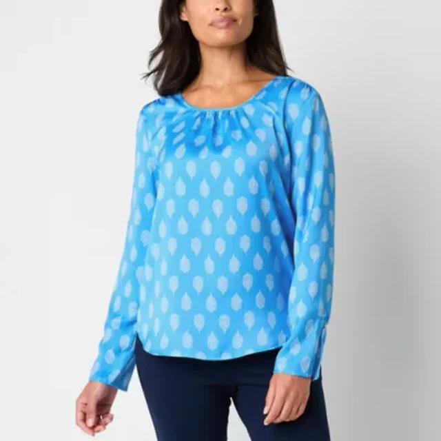 Liz Claiborne Womens Round Neck Long Sleeve Satin Blouse