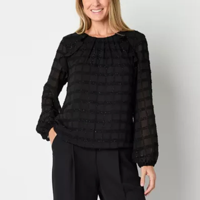 Liz Claiborne Womens Round Neck Long Sleeve Satin Blouse