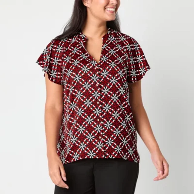 Liz Claiborne Womens Plus Split Crew Neck Cap Short Sleeve Regular Fit Button-Down Shirt