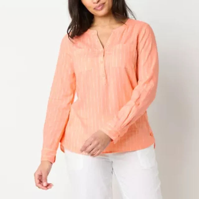 Liz Claiborne Womens Tall Split Crew Neck Roll Tab 3/4 Sleeve Regular Fit Button-Down Shirt