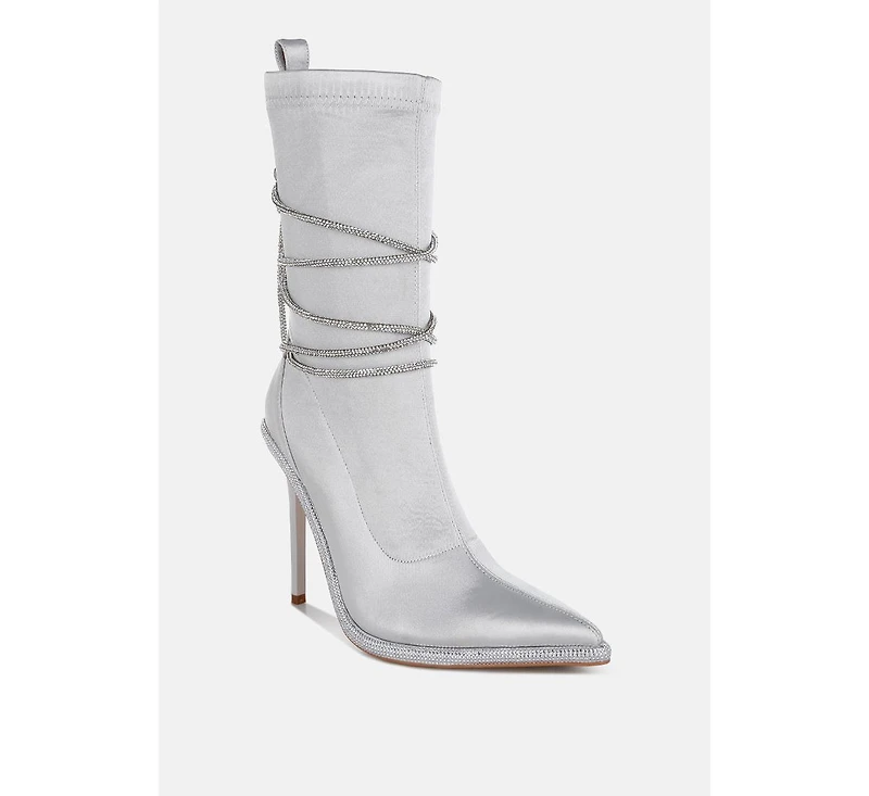The metallic satin boots are so chic and glamorous with the alluring rhinestones embellished strap wrap around. The stiletto boots have pull tabs, making them easy to wear, and comfortable cushion insoles that cut strain. Type: Boots | Upper Material: Satin | Outer Sole: Tpr | Closed Pointed Toe | Stiletto Heel | Rhinestones Strap Wrap Around Detail | Zipper Fastening | Pull Tabs | Comfortable Cushion Insoles | Heel Height: 4 inches | Style Code: SH5086.