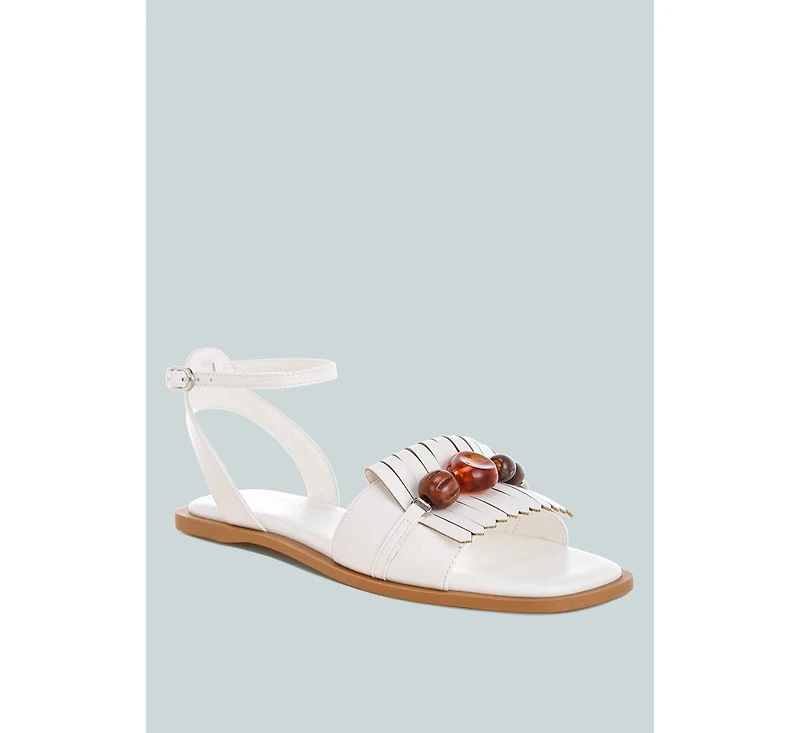 The flat sandals have a chic bohemian flair with the beads and fringe detail. The ankle strap fastening ensures a secure fit, while the flat heel and cushioned insoles are comfortable. Type: Sandals Outer Sole: Tp Rubber Open Square Toe Flat Heel Pin Buckle Ankle Strap Fringe Detail Beads Embellishment Soft Cushion Insole SH5828