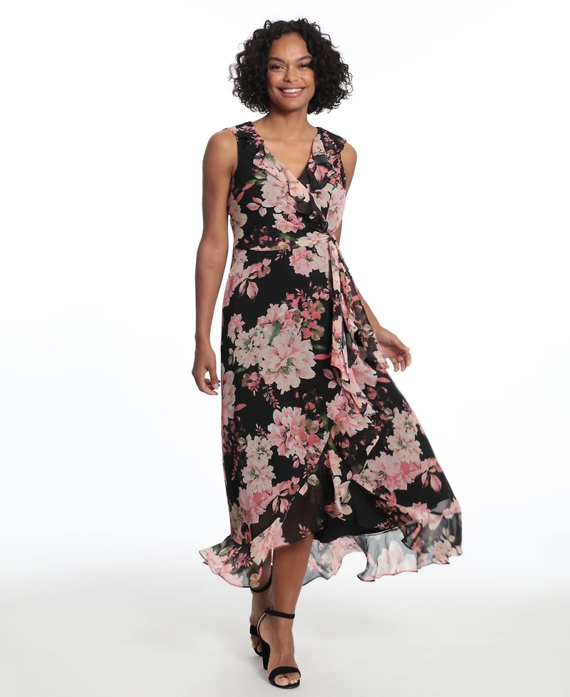 London Times Women's Side Tie Ruffle Wrap V-Neck Dress