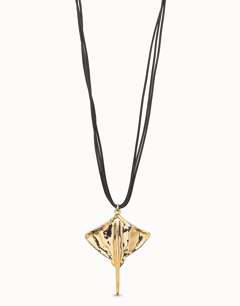 Sterling silver-plated pendant with long leather chain and a manta ray. Get the collection Ser Majestuosa with its elegant and organic pieces that evoke the dance of the manta ray across the sea.
