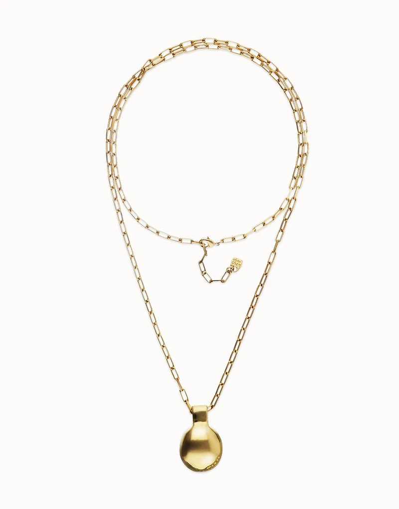 This necklace turns the idea of returning to the origin into a simple, powerful gesture. Its single long chain, designed to be worn doubled, creates a path that folds back on itself like a symbol of return—two loops that speak to each other and always find their meeting point.