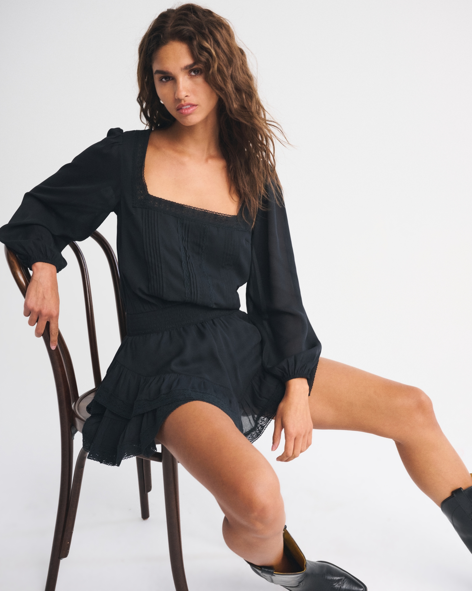 Flattering long-sleeve mini dress in our synthetic georgette fabric and easy waist silhouette, featuring lace details along the square neckline and a ruffle skirt with built-in shorts.