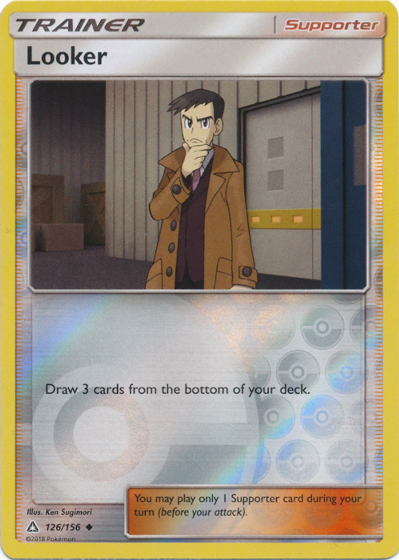 Set: Sun & Moon: Ultra Prism Card Number: 126/156 Rarity: Uncommon Card Type: Trainer - Supporter Name: Looker Finish: Regular Card Text: Draw 3 cards from the bottom of your deck.