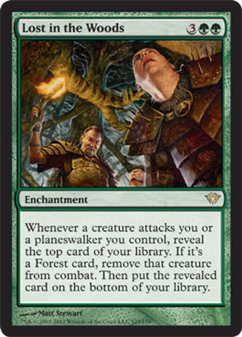 Color: Green Card Text: Whenever a creature attacks you or a planeswalker you control , reveal the top card of your library. If it's a Forest card remove that creature from combat. Then put the revealed card on the bottom of your library. Rarity: R Cost: 3GG Card Type: Enchantment Artist: Matt Stewart Name: Lost in the Woods Finish: Foil Card Number: 123/158 Set Name: Dark Ascension