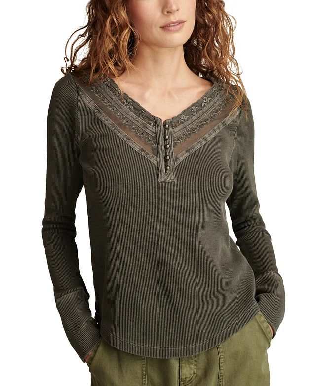 Lucky Brand Women's Valentine Pointelle Trim Rib Henley Top