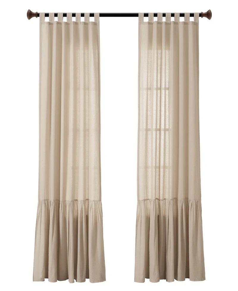 Add timeless style to your windows with the Farmhouse Faux Linen Tab Top Curtains. This solid color, linen-textured window panel features a ruffled bottom, adding charming texture to your home. These light filtering curtains for bedroom provide moderate privacy while helping to filter sunlight, allowing a soft glow to fill the space. These neutral curtains are crafted from a linen-textured cotton fabric blend and are unlined. Sold as a single panel, measuring 40 inches wide by 84 inches long. They complement modern farmhouse, country cottage, and transitional decor styles. These drapes offer seamless installation with its 4" tab top, allowing you to easily slide it onto your curtain rod, or by using clip rings (not included). To care for these living room curtains, simply machine wash cold on the gentle cycle and tumble dry low. Use an iron on low heat to release wrinkles, if needed.
