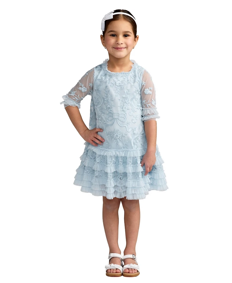 Girls Floral Embroidered Mesh Dress with Ruffle Neckline and Sheer Sleeves. Features delicate floral embroidery, tiered skirt, and soft ruffle details. Fully lined body with airy unlined sleeves. Perfect for weddings, parties, holidays, and special occasions.