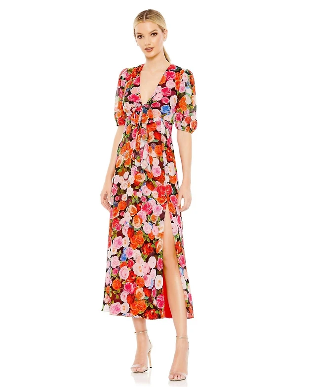 Mac Duggal Women's Floral Print Front Tie Puff Sleeve Flowy Midi Dress