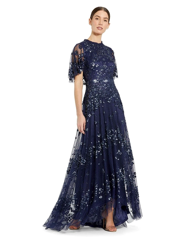 Mac Duggal Women's Sequined High Neck Flutter Sleeve A Line Gown