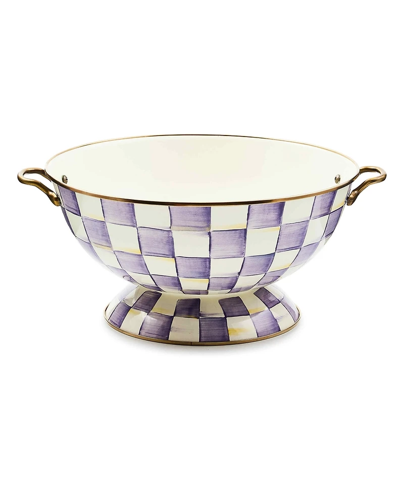 Handle every task with this everything bowl from MacKenzie-Childs, boasting a hand-painted check design. Antiqued brass-finished handles provide a comfortable and stylish grip. Its generous capacity is suitable for mixing, serving, or displaying.