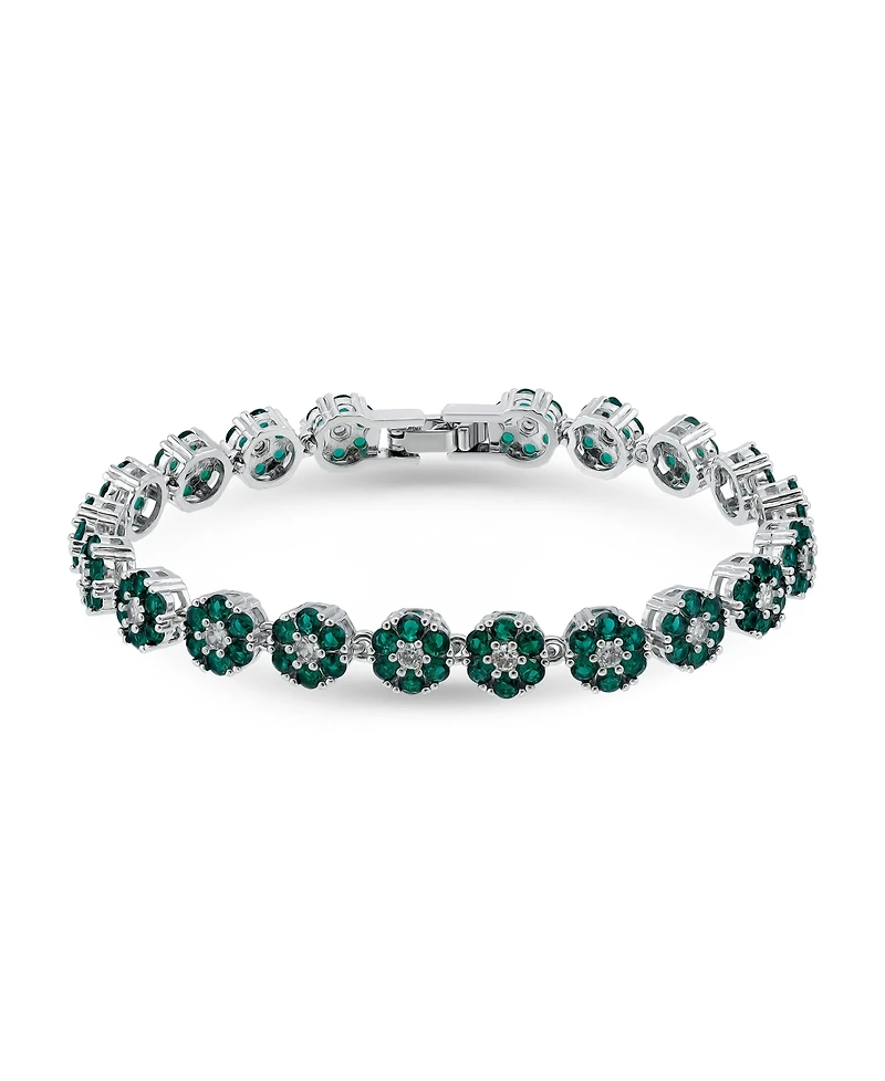 Add a feminine floral touch to your look with this cubic zirconia and created ruby cluster flower tennis bracelet created for Macy's. Silver plated with a secure fold over clasp, this bracelet is a beautiful piece on its own or a perfect addition to a stack.